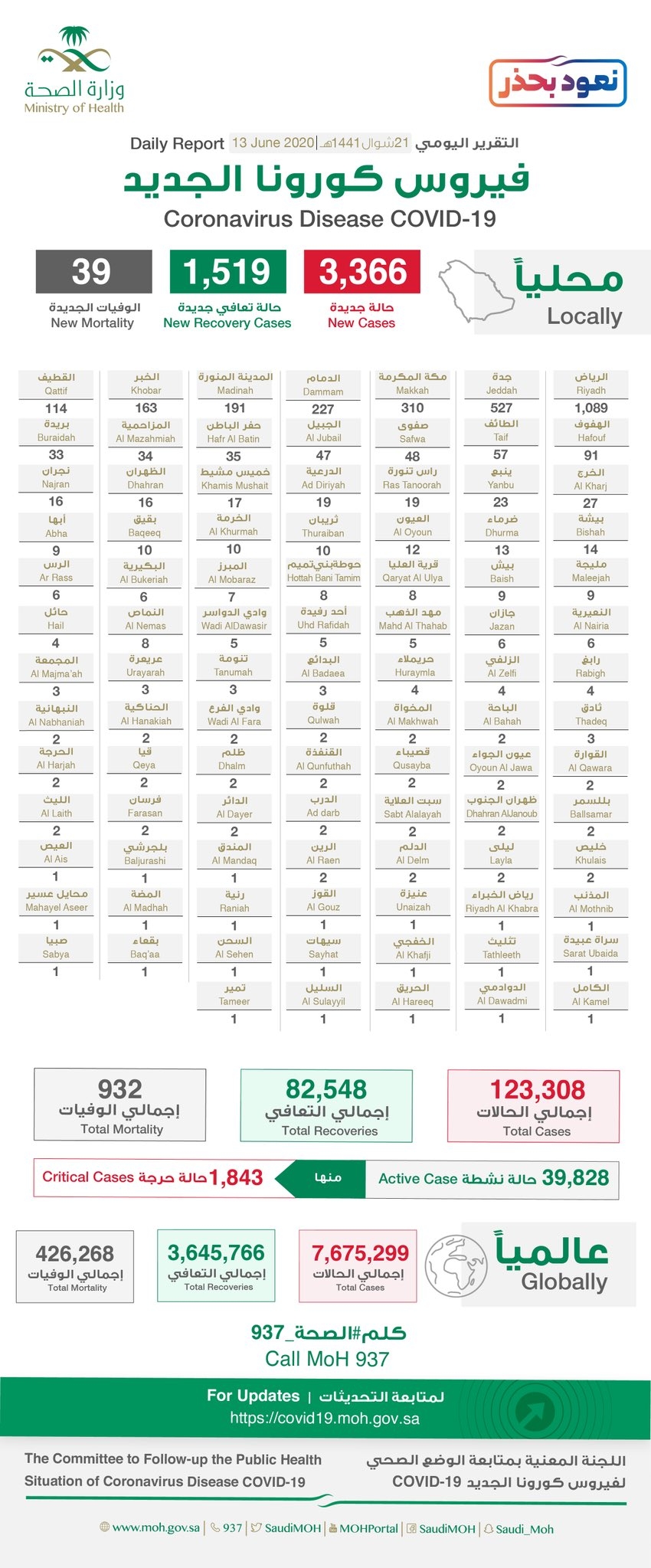 #عاجل.. من بينها 9 حالة سجلت في مدينة #نجران سجلت محافظة شرورة 5 حالات ومحافظة خباش حالة واحدة.. الصحة: تسجيل ( 3369) حالة مؤكدة جديدة مصابة بفيروس كورونا.. تعرف على توزيع الحالات حسب مدن المملكة