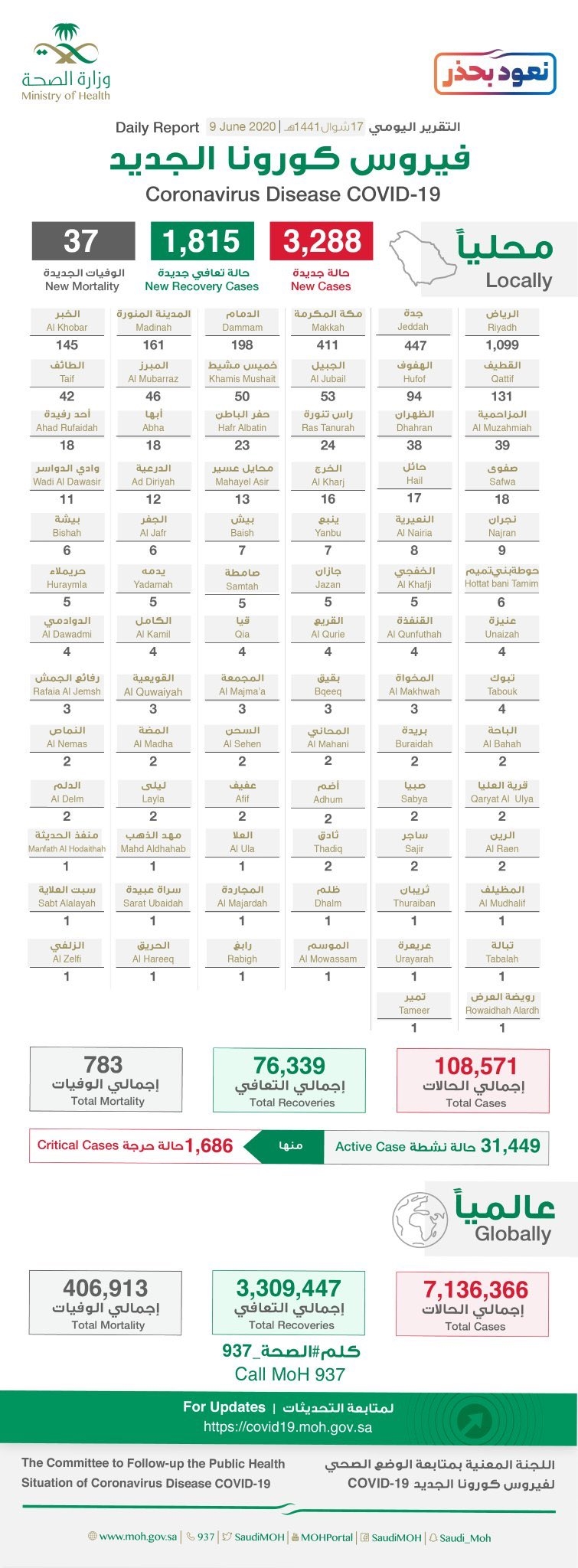 سجلت مدينة نجران 9 حالات جديده و 5 حالات في محافظة يدمه .. الصحه :- تعلن عن تسجيل (3288) حالة إصابة جديدة بفيروس #كورونا الجديد