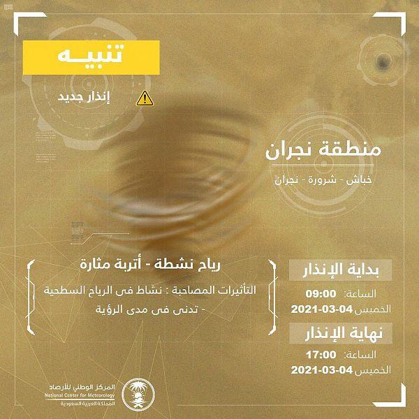 المركز الوطني للأرصاد: رياح نشطة وأتربة مثارة على منطقة نجران