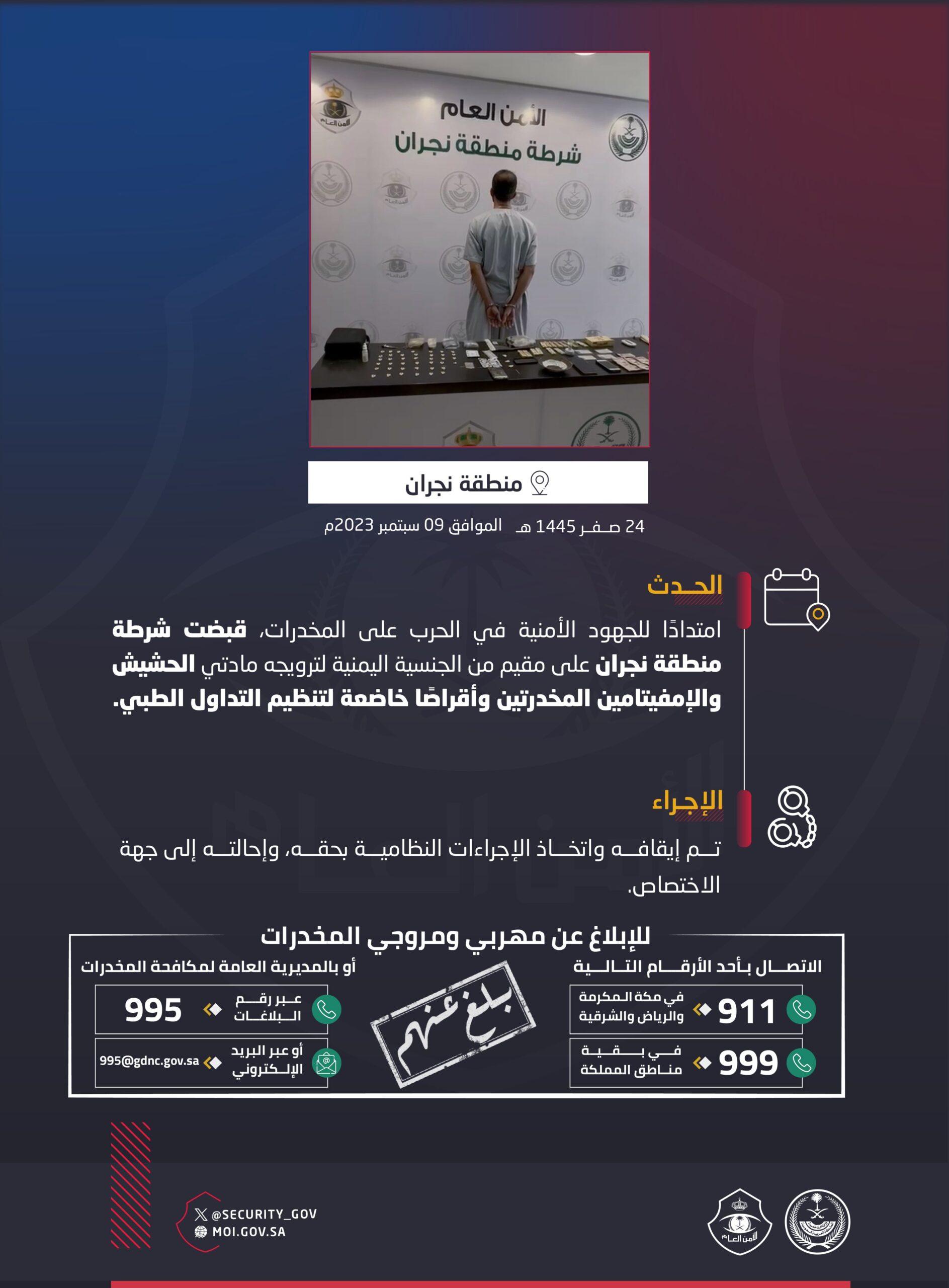 شرطة منطقة نجران تقبض على مقيم لترويجه مواد مخدرة