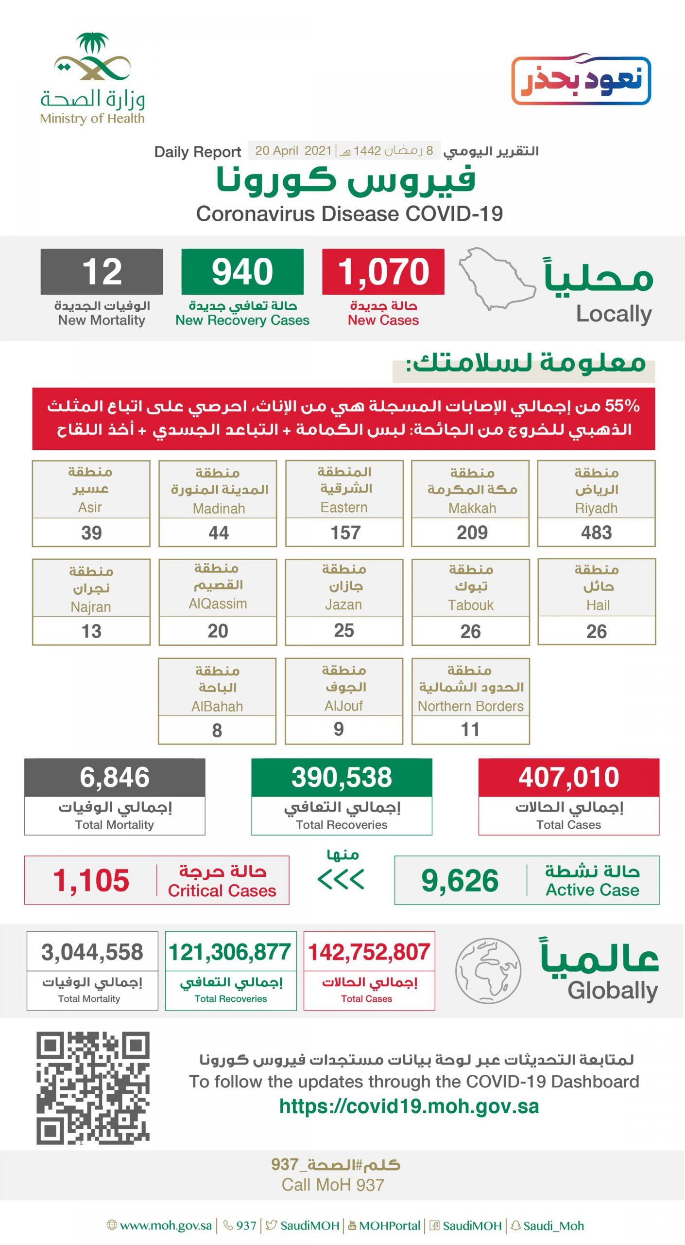 #الصحة تعلن عن تسجيل (1070) حالة إصابة جديدة بفيروس كورونا (كوفيد-19)، وتسجيل (12) حالات وفيات رحمهم الله، وتسجيل (940) حالة تعافي ليصبح إجمالي عدد الحالات المتعافية (390,538) حالة ولله الحمد.