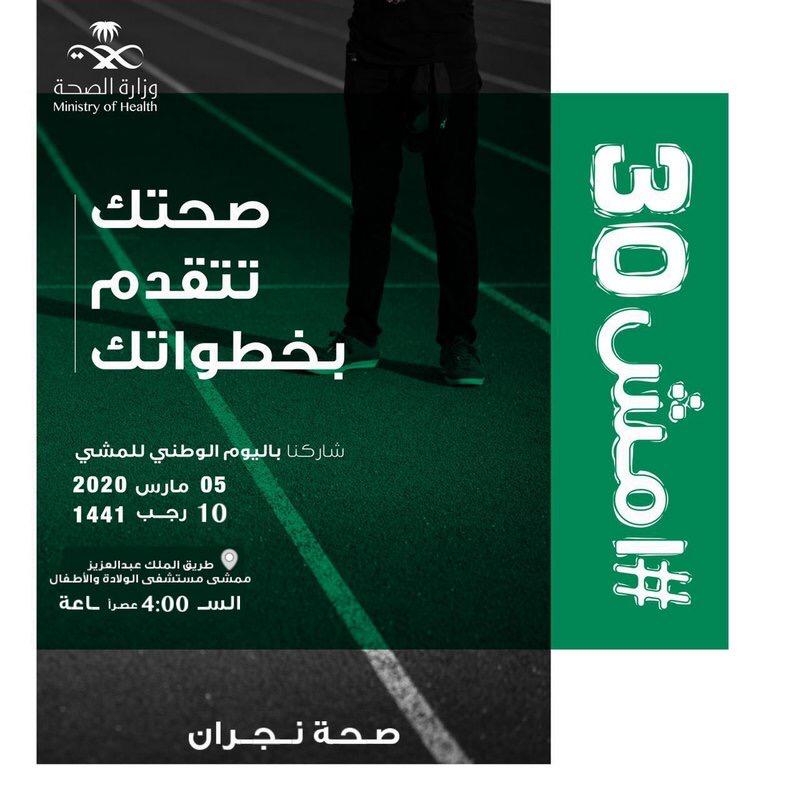 أعلنت المديرية العامة للشؤون الصحية بمنطقة نجران، عبر حسابها الرسمي، عزمها إطلاق فعالية اليوم الوطني للمشي الخميس 5 مارس، في ممشى طريق الملك عبدالعزيز بجوار مستشفى الولادة والأطفال، في تمام الساعة الرابعة عصرًا.