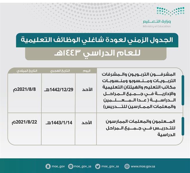 أعلنت وزارة التعليم، اليوم (الأربعاء)، مواعيد عودة شاغلي الوظائف التعليمية للعام 1443هـ وفقاً للجدول الزمني.