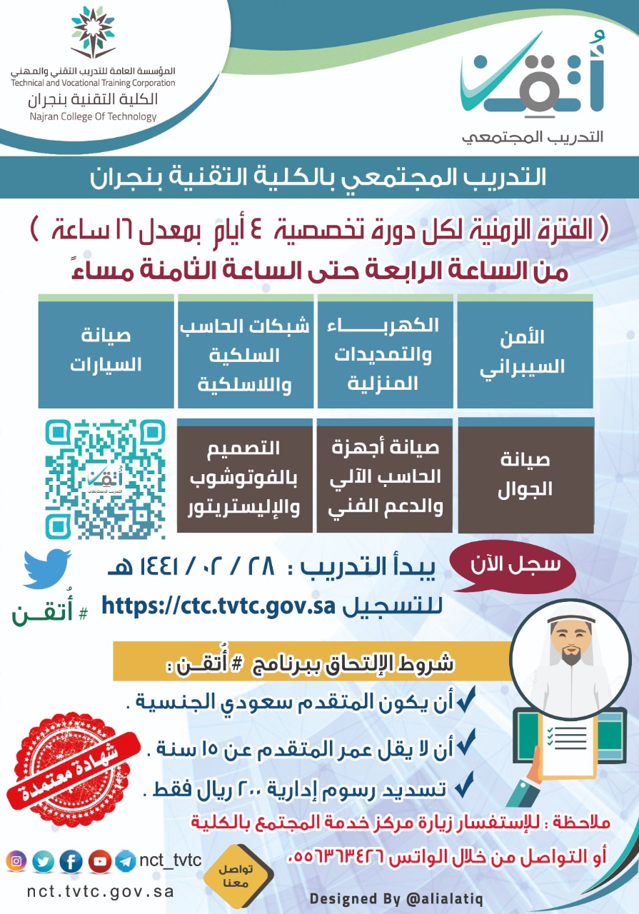 تواصل الكلية التقنية بنجران استقبال طلبات التسجيل في برامج التدريب المجتمعي “برنامج أُتْقِن “، وذلك من خلال البوابة الإلكترونية https://ctc.tvtc.gov.sa…