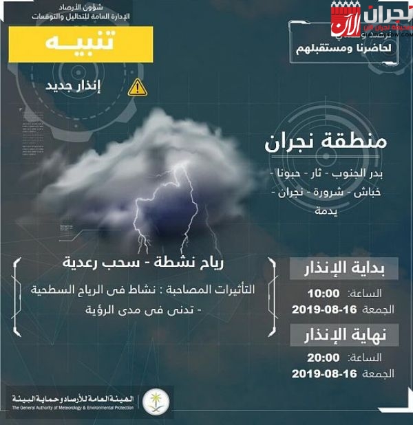 نبّهت الهيئة العامة للأرصاد وحماية البيئة اليوم، من تكون سحب رعدية تُصحب بنشاط في الرياح السطحية، وشمل التنبيه مدينة نجران…