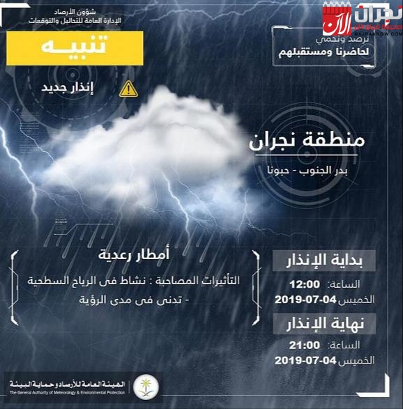 تشمل محافظات حبونا وبدر الجنوب .. الأرصاد تنبه من هطول أمطار رعديه على منطقة نجران