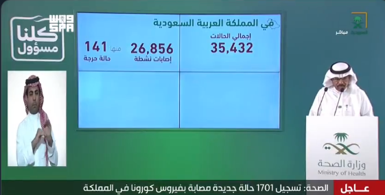 أعلنت وزارة الصحة، اليوم (الجمعة)، تسجيل 1701 إصابة مؤكدة جديدة بفيروس كورونا المستجد (كوفيد 19)، ليرتفع إجمالي عدد الحالات في المملكة إلى 35432 حالة.