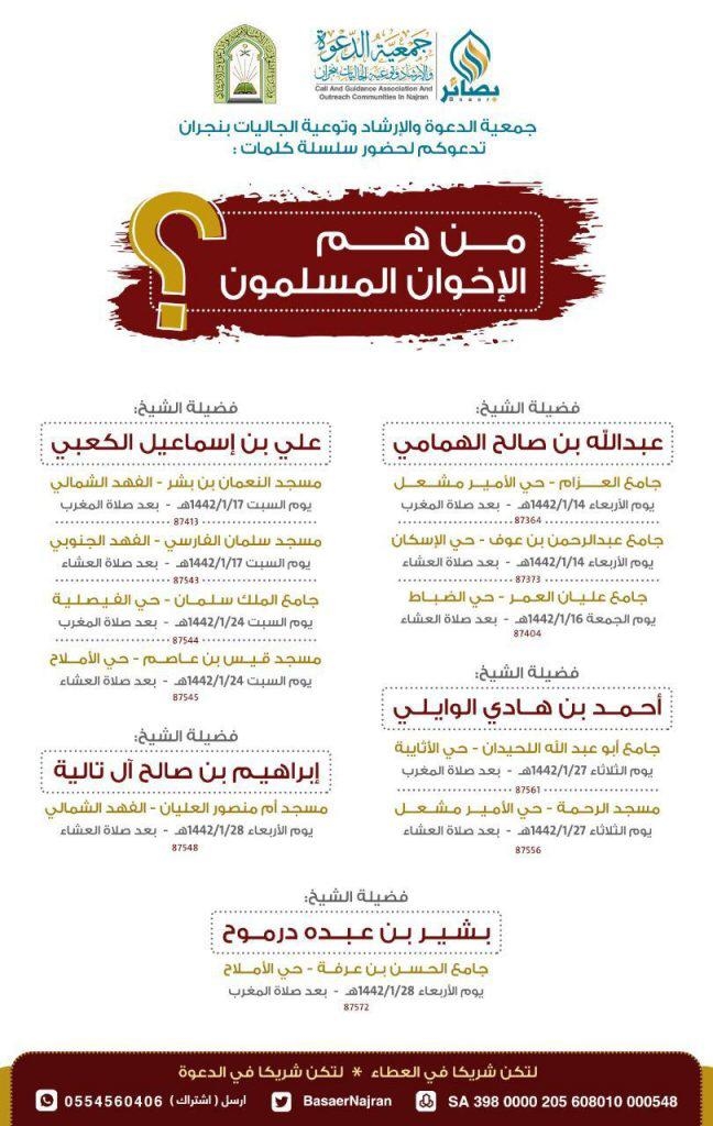 ينظم فرع وزارة الشؤون الإسلامية والدعوة والإرشاد بمنطقة نجران، خلال شهر محرم الجاري، سلسلة من الكلمات بعنوان: (من هم الإخوان المسلمون؟) يلقيها عدد من الدعاة في جوامع ومساجد مدينة نجران بعد صلاتي المغرب والعشاء، في إطار برامجها الأمن الفكري والتوعية بخطر التنظيمات الإرهابية المحظورة .
