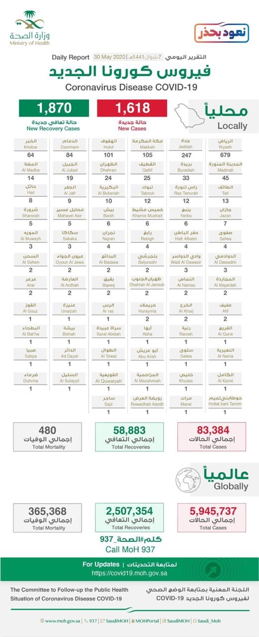 سجلت منطقة نجران منها 9 حالات جديدة ..  الصحة: تسجيل (1618) حالة مؤكدة جديدة مصابة بفيروس كورونا.. تعرف على توزيع الحالات حسب مدن المملكة