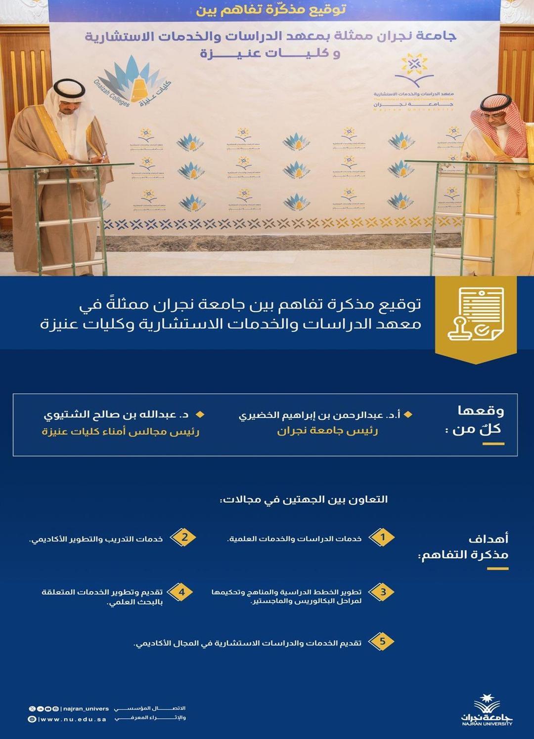 وقّع المذكرة رئيس جامعة نجران الدكتور عبدالرحمن بن إبراهيم الخضيري، ورئيس مجالس أمناء كليات عنيزة الدكتور عبدالله بن صالح الشتيوي .