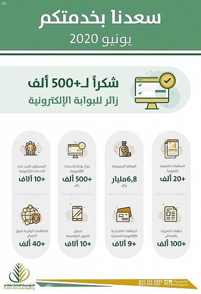 وفي إطار خدماتها المقدمة لعملائها عبر البوابة الإلكترونية وتطبيقها للأجهزة الذكية خلال شهر يونيو، أصدرت المؤسسة أكثر من 100 ألف تعريف بالمعاش، وأكثر من تسعة آلاف بطاقة تقاعدية إلكترونية، وبلغ عدد مرات التحميل الجديدة لتطبيق المؤسسة خلال شهر يونيو أكثر من عشرة آلاف تحميل.
