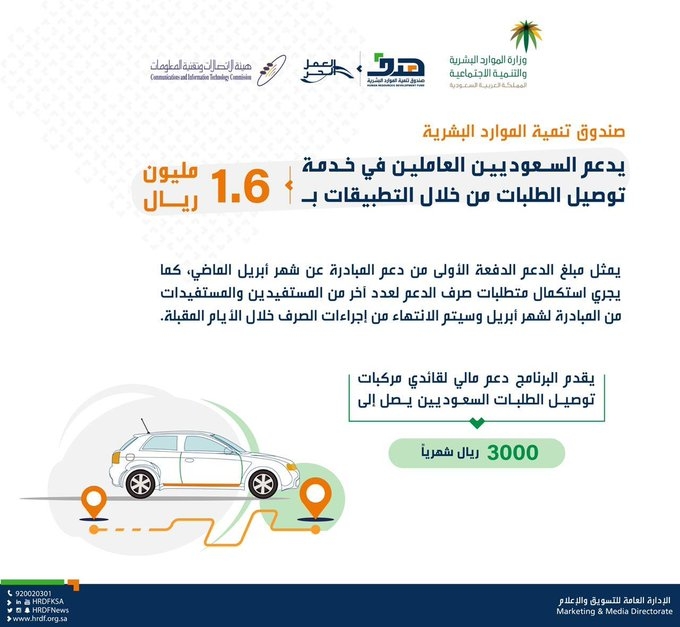 يشار إلى أن برنامج “دعم العمل الحر للعاملين في خدمة توصيل الطلبات من خلال التطبيقات”، يأتي ضمن مبادرات الصندوق الهادفة لرفع مستويات التوطين في هذا النشاط، وخلق فرص عمل جديدة تلبي أنماط العمل المختلفة ومنها (العمل الحر)، واستجابة للإجراءات الصحية الاحترازية التي اعتمدتها الدولة من خلال عدد من المؤسسات الحكومية والمحفزات المالية للحد من التبعات الاقتصادية والصحية لجائحة “كورونا”، حيث يقدم البرنامج دعماً مالياً لقائدي مركبات توصيل الطلبات السعوديين، يصل إلى 3000 ريال شهريًا، لمدة شهرين ميلاديين.