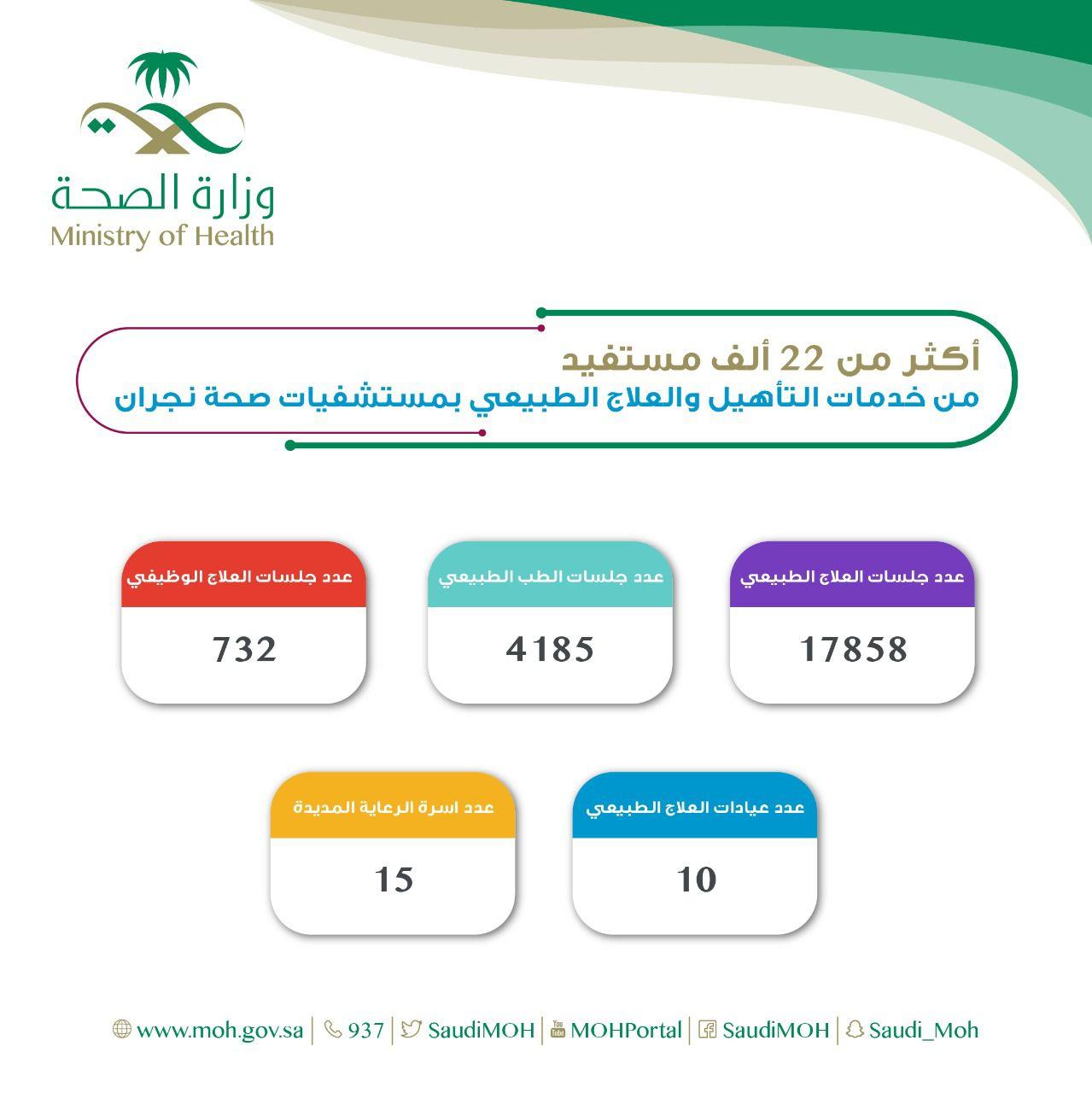 قدمت مراكز التأهيل والعلاج الطبيعي بمستشفيات صحة نجران خدماتها لـ 22775 مستفيدًا وذلك خلال الربع الثالث من العام الجاري 2021.