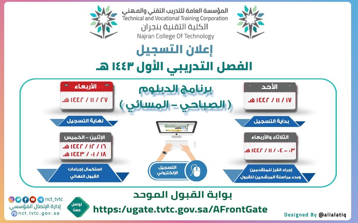 تبدأ الكلية التقنية بنجران يوم الأحد القادم استقبال طلبات القبول في برنامج الدبلوم الصباحي والمسائي للفصل التدريبي الأول من العام التدريبي 1443 هـ، وسيكون التسجيل متاحاً حتى الـ 27 من شهر ذو القعدة وذلك عبر موقع بوابة القبول الموحد https:/ugate.tvtc.gov.sa/AFrontGate.