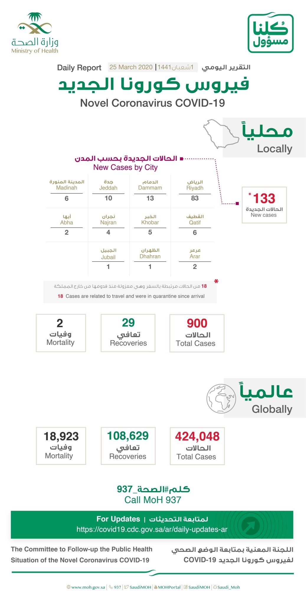 أعلن المتحدث الرسمي باسم وزارة الصحة محمد العبدالعالي، اليوم الأربعاء، أن عدد الحالات الجديدة المصابة بفايروس كورونا في المملكة بلغ 900، بعد تسجيل 133 حالة جديدة، منها 4 حالات جديدة سجلت في منطقة نجران لترتفع عدد الحالات إلي 12 حاله.