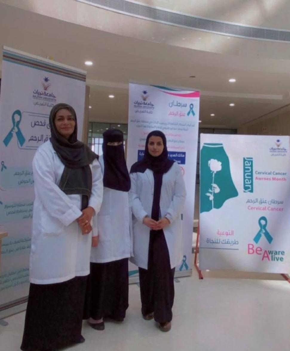 نظمت كلية التمريض بشطر البنات في جامعة نجران، ندوة علمية بعنوان: «التوعية طريقك للنجاة» للتوعية عن سرطان عنق الرحم استهدفت طالبات ومنسوبات الجامعة، وهدفت الندوة التي شهدت حضور عدد كبير من الطالبات، إلى التوعية عن رابع السرطانات شيوعاً بين النساء عالمياً، وثامن السرطانات شيوعاً بالسعودية «سرطان عنق الرحم»، وأهم مسبباته وأعراضه وطرق الوقاية منه، وتناولت الندوة التي قدمتها الدكتورة ورقاء هاشم، وهند المطيري، ومرام الحميري، واعتدال عطية، التعريف عن أعراض وعلامات سرطان عنق الرحم، والتوصية بأخذ لقاح فيروس الورم الحليمي، عند عمر 11-12 سنة للبنات، وكذلك كيفية إجراء فحص مسحة عنق الرحم.