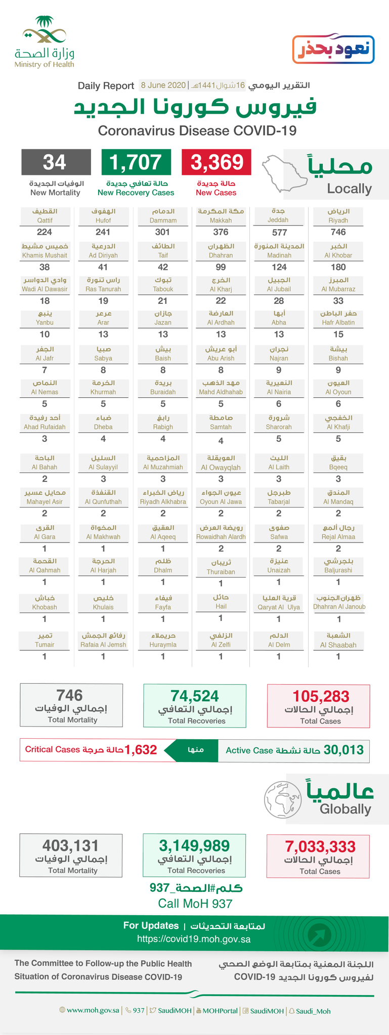 #عاجل.. من بينها 9 حالة سجلت في مدينة #نجران سجلت محافظة شرورة 5 حالات ومحافظة خباش حالة واحدة.. الصحة: تسجيل ( 3369) حالة مؤكدة جديدة مصابة بفيروس كورونا.. تعرف على توزيع الحالات حسب مدن المملكة
